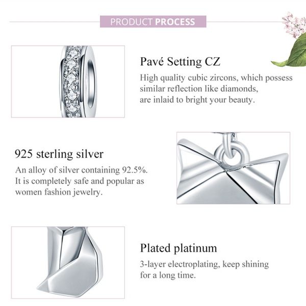 Srebrni privezak SCC517 je deo naše elegance kolekcije. Ručno završen srebrni privezak sa motivima zvezdica i srca. Napravljen je od izuzetno kvalitetnog srebra 925 sa kubnim cirkonima AAA klase, kombinovana sa jedinstvenim dizajnom. Može se nositi na narukvici ili ogrlici. Privezak je kompatibilan i sa proizvodima drugih poznatih proizvodjača nakita.